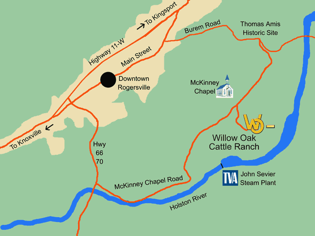 Turn Right onto McKinney Chapel Road, 4.1 miles to Willow Oak Ranch.